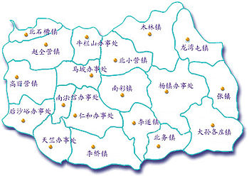 - 鎮(zhèn):張鎮(zhèn)、大孫各莊鎮(zhèn)、北務鎮(zhèn)、李遂鎮(zhèn)、木林鎮(zhèn)、南彩鎮(zhèn)、北小營鎮(zhèn)、李橋鎮(zhèn)、高麗營鎮(zhèn)、趙全營鎮(zhèn)、北石槽鎮(zhèn)、龍灣屯鎮(zhèn)。